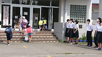 今週及び来週、生徒会執行部を中心として、小学生とのあいさつ交流会を行います。これは、六中生徒会執行部を中心とするメンバーが、朝、小学校に赴き、そこであいさつ運動を行うものです。平成元年まで行っており、昨年、一昨年と感染防止のため休止していましたが、今年度再開しました。本日は塩井小学校で行いました。中学生のあいさつに対して、小学生も元気にあいさつを返してくれました。14日は六郷小、15日は窪田小、21日は広幡小で行う予定です。